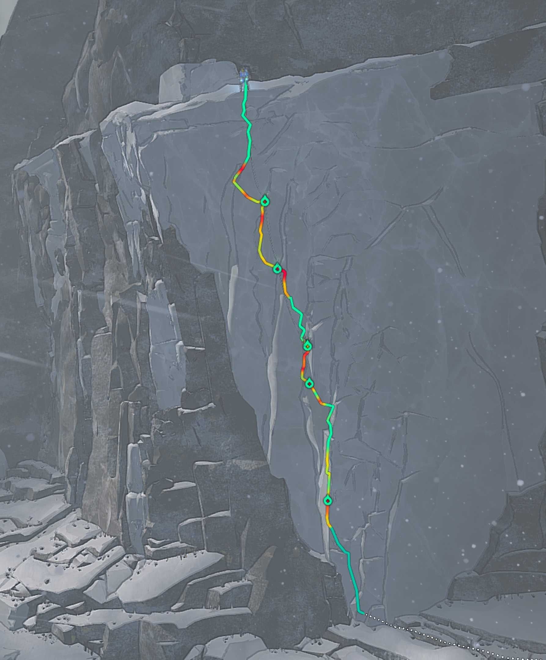 It starts at the bottom of the Serac edge. Aim the edge at the right of the main one. Go precisely, strike and up! Technical but easy one (Beginner friendly).