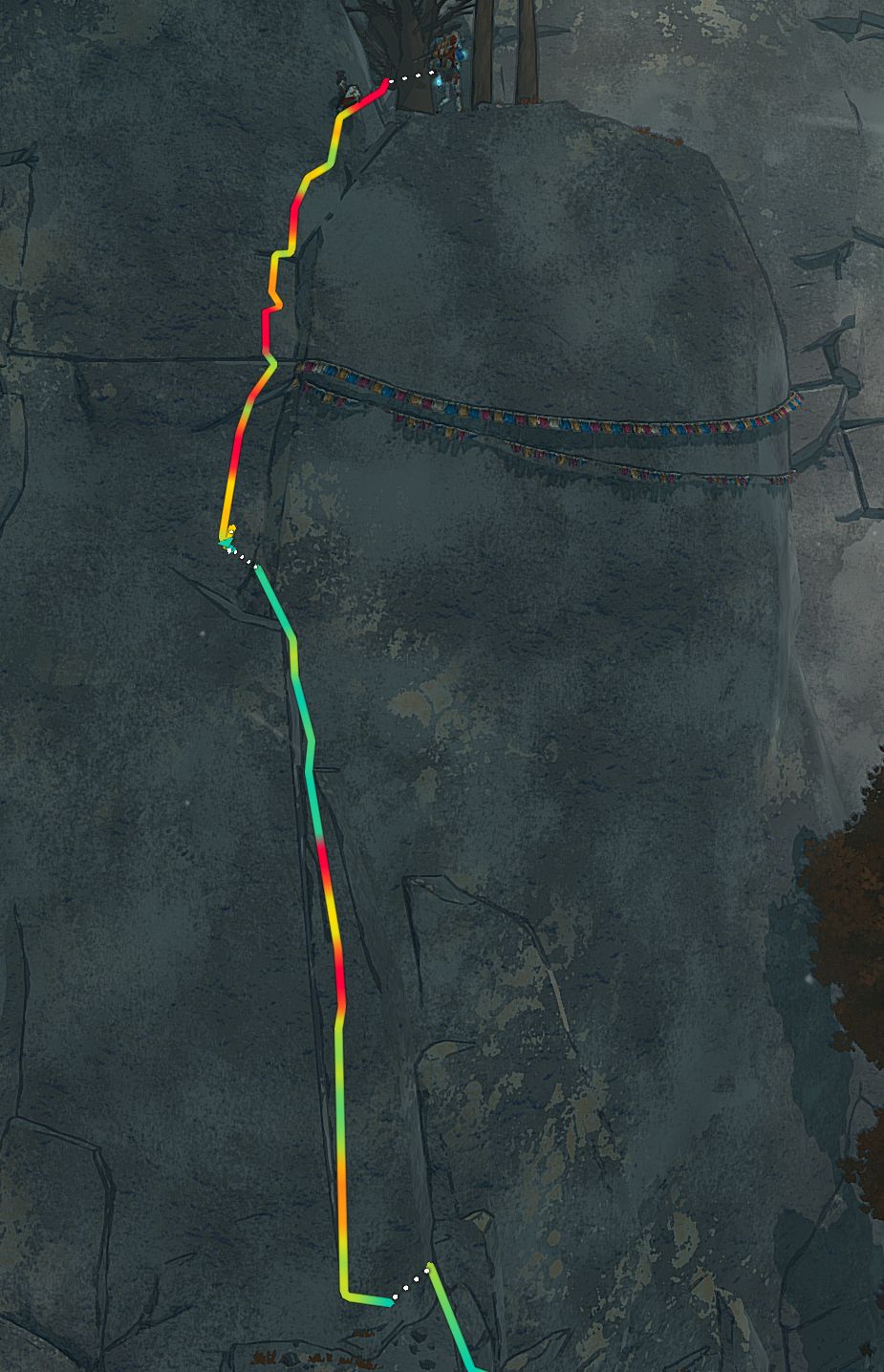 The route starts on a small balcony and goes up through a long, straight chute to another, even smaller balcony. The second half of the route is a bit harder and ultimately leads to a backpack with unique loot that is definitely worth the climb.