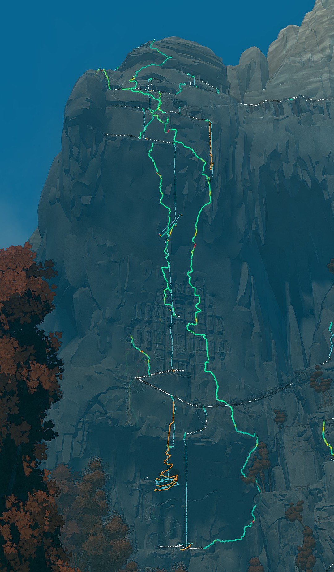 This route starts down at the lowest platform of The Ancient and snakes it's way up past The Palace of the Wind, The Peril, and on to the top of The Dome. Do NOT climb onto or rest on any ledges.