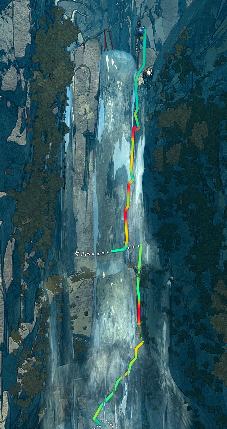Swim upstream against the current. It's hard to see, it's wet, and the second half -- a long vertical edge -- is a bit harder.