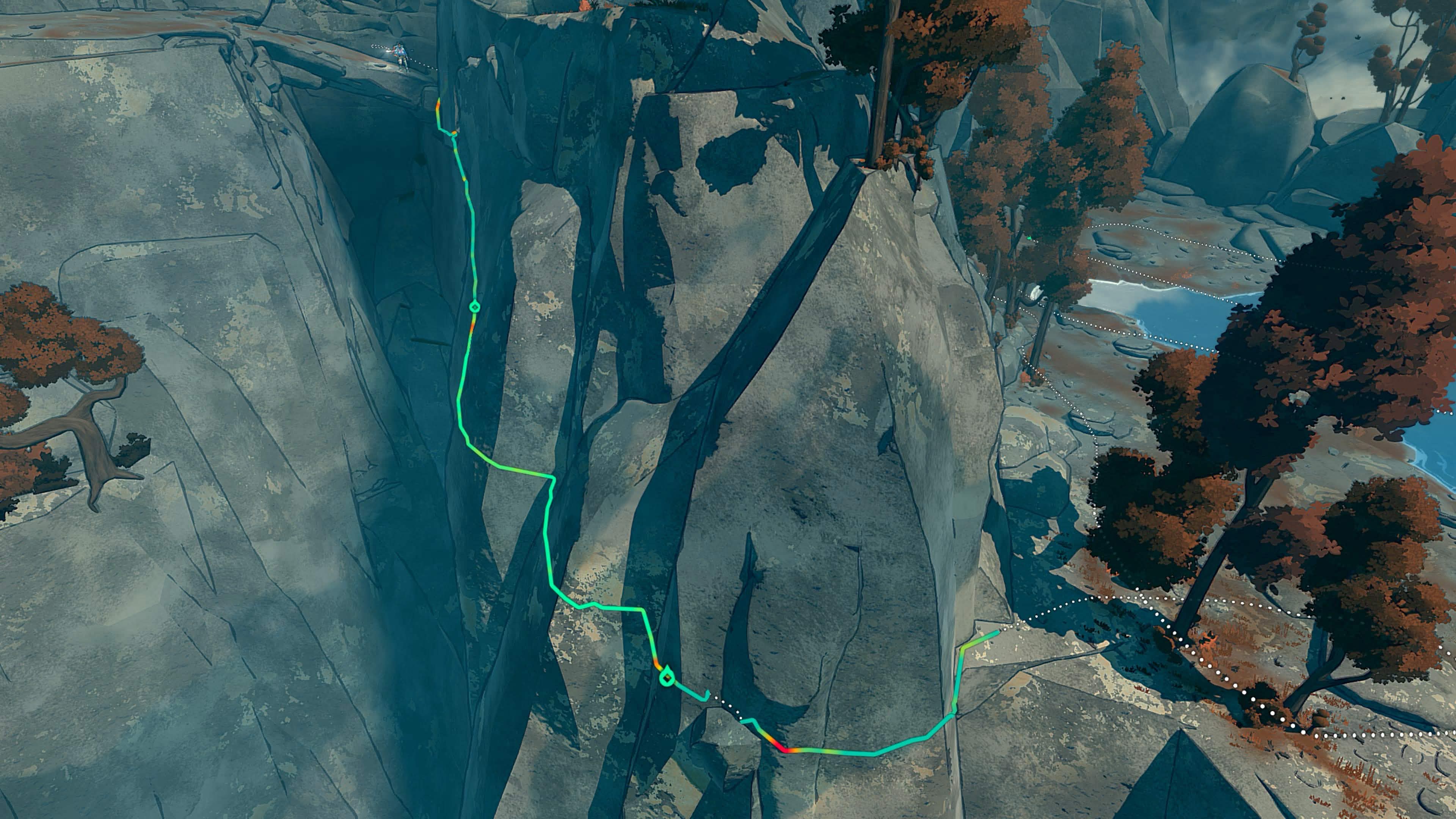 Climb across the gorge on backside of the ridge while staying well below the upper ledges. There are three ending variations: Going up toward the top of the pinched boulder, staying in the middle to end on the bridge, or going beneath the bridge to end at the far wall. Note: Though it's possible to go beneath the bridge, it's not recommended as there is an out-of-bounds reset that can be tricky to avoid.