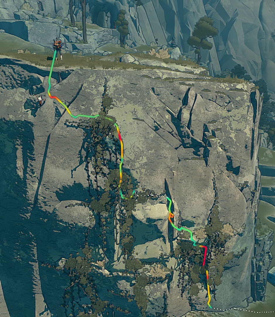 The route starts on a hook in the wall, which you must first climb up to and pass by. It then continues upwards until you come to a flat stone--this can be walked on to the next part of the climb. From there, move left through the bushes and be sure to find rests whenever you can.
